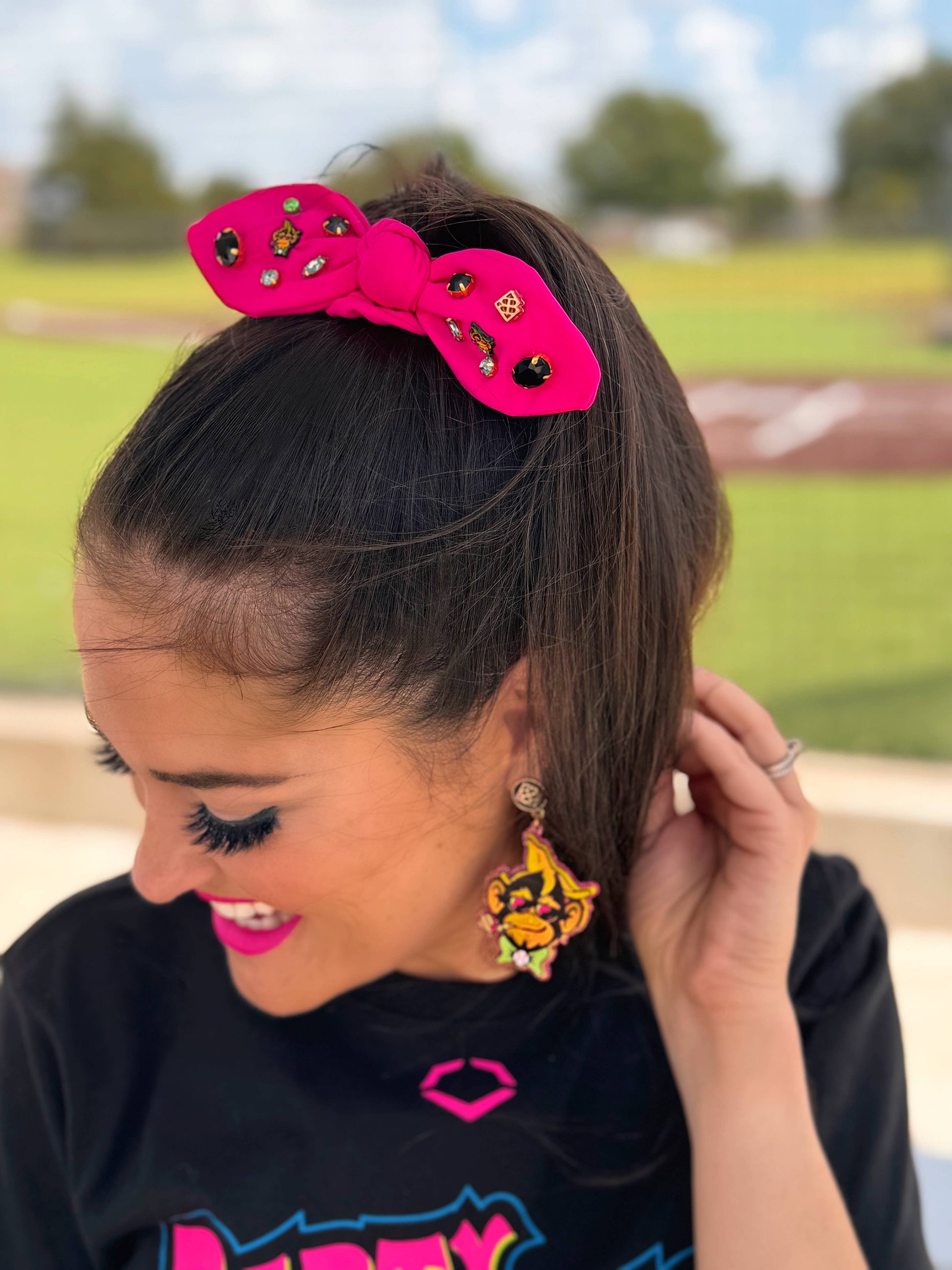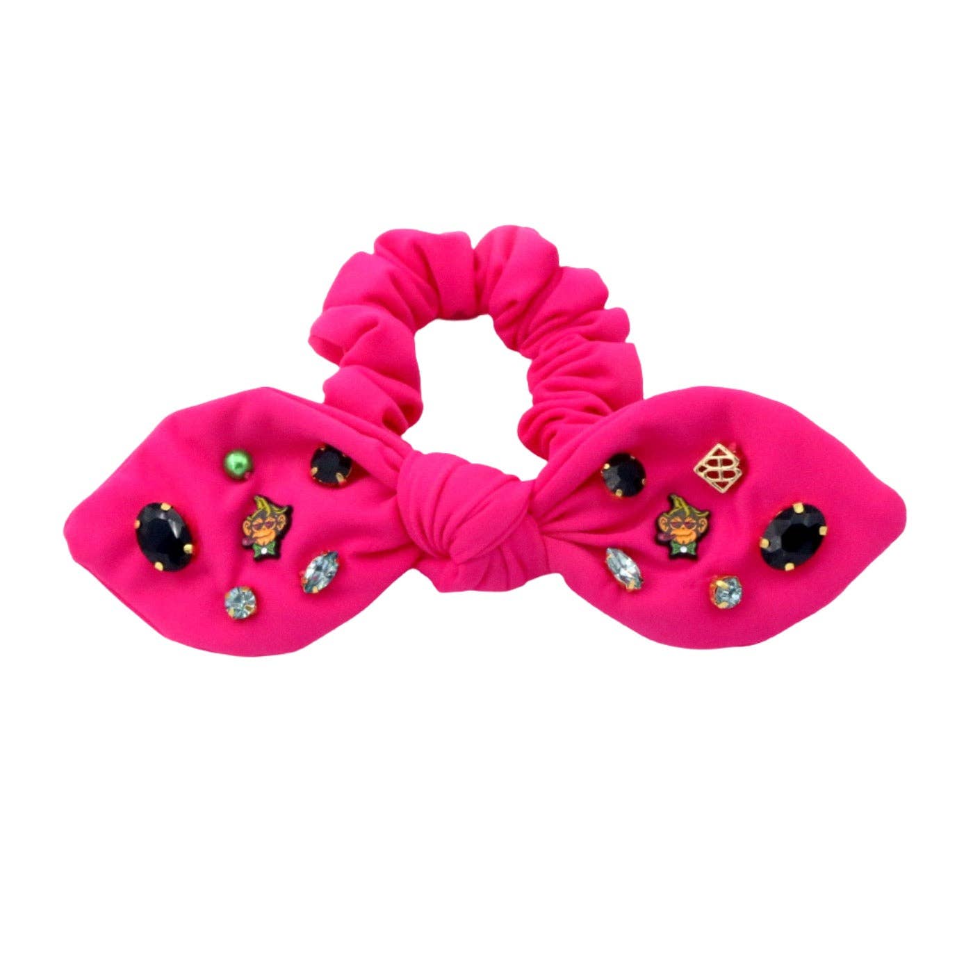 * Pink Bow Scrunchie with Party Animals Gold Plated Logo Charms and Hand-Sewn Crystals