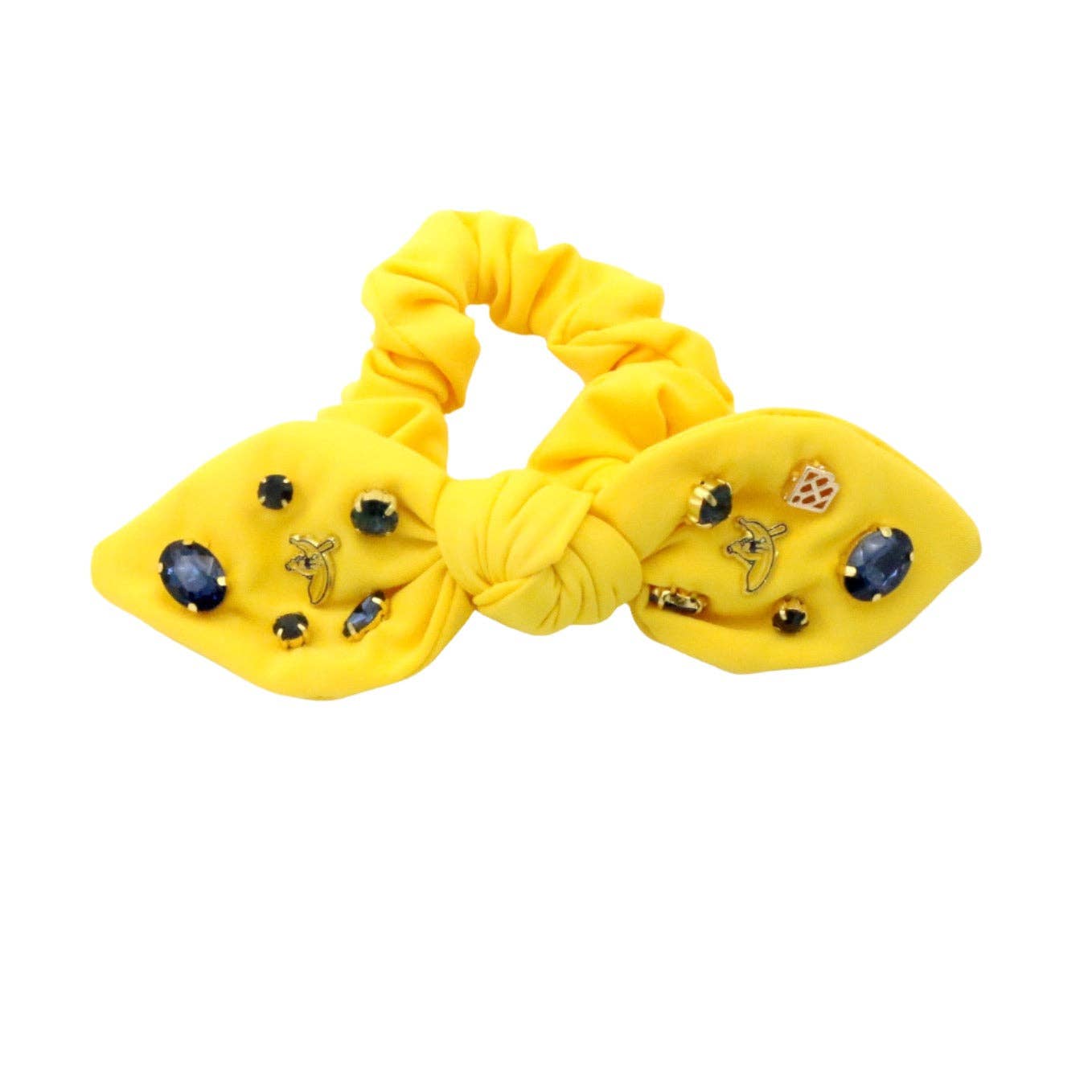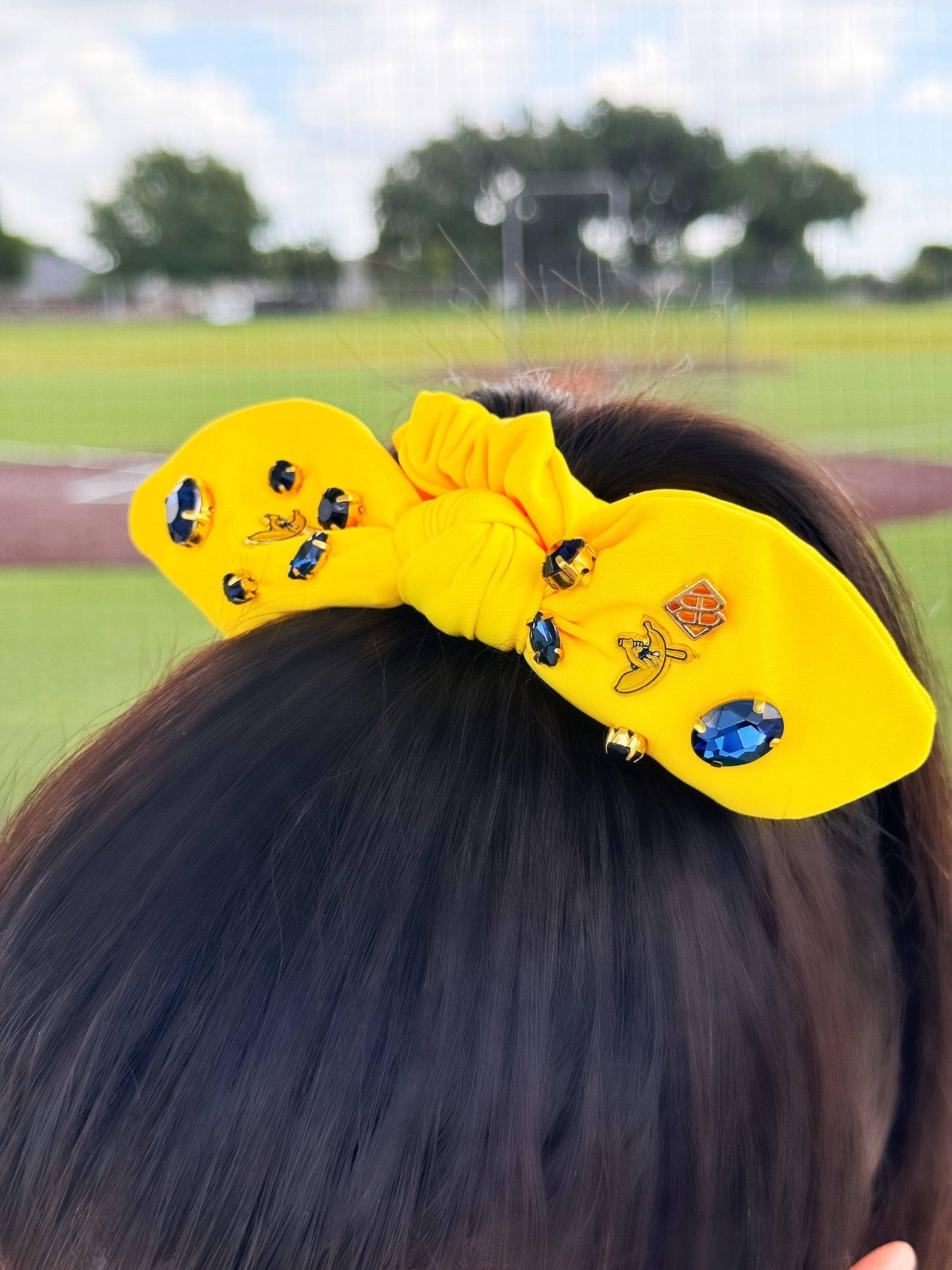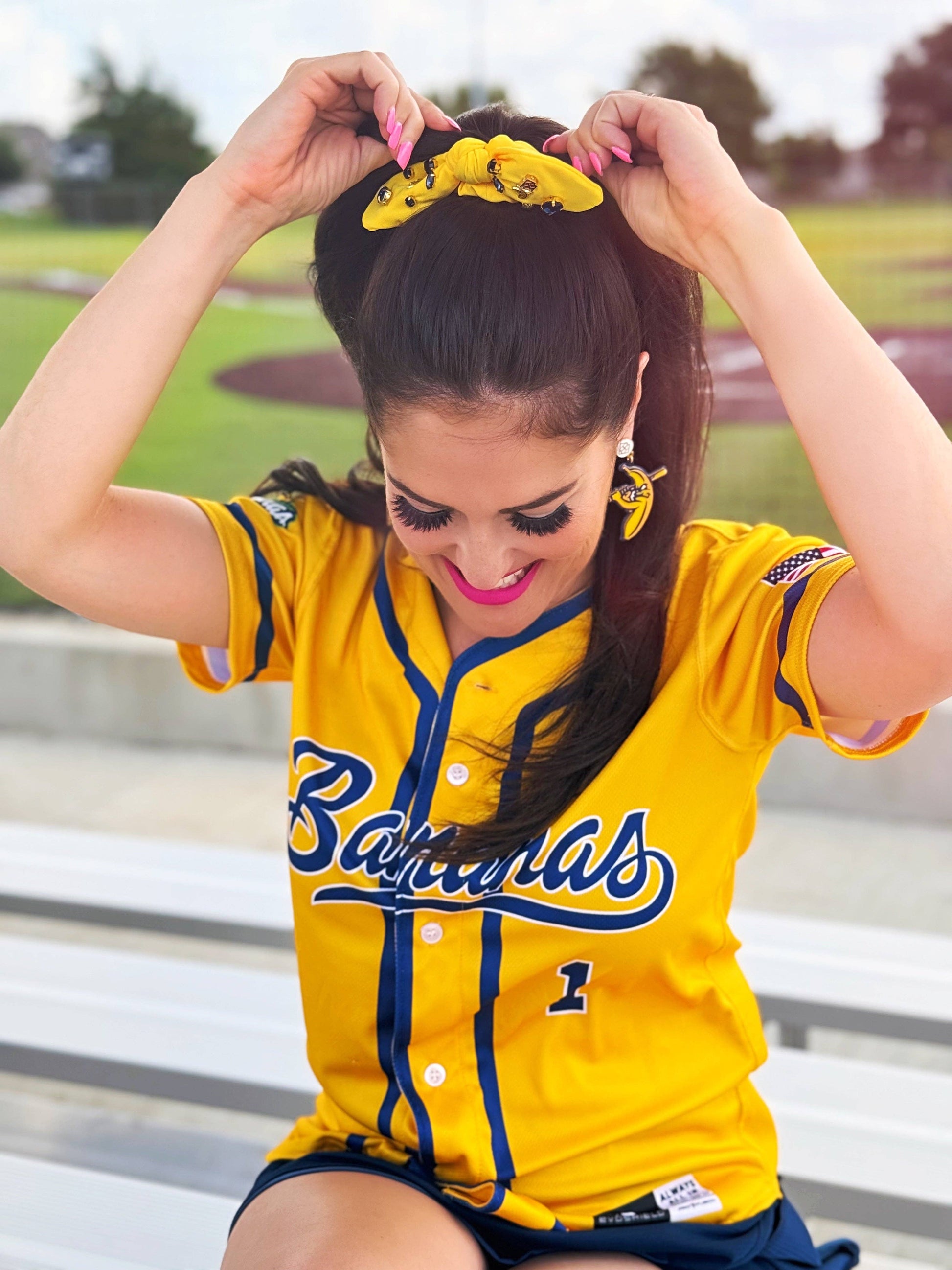 * Yellow Bow Scrunchie with Savannah Bananas Gold Plated Logo Charms and Hand-Sewn Crystals